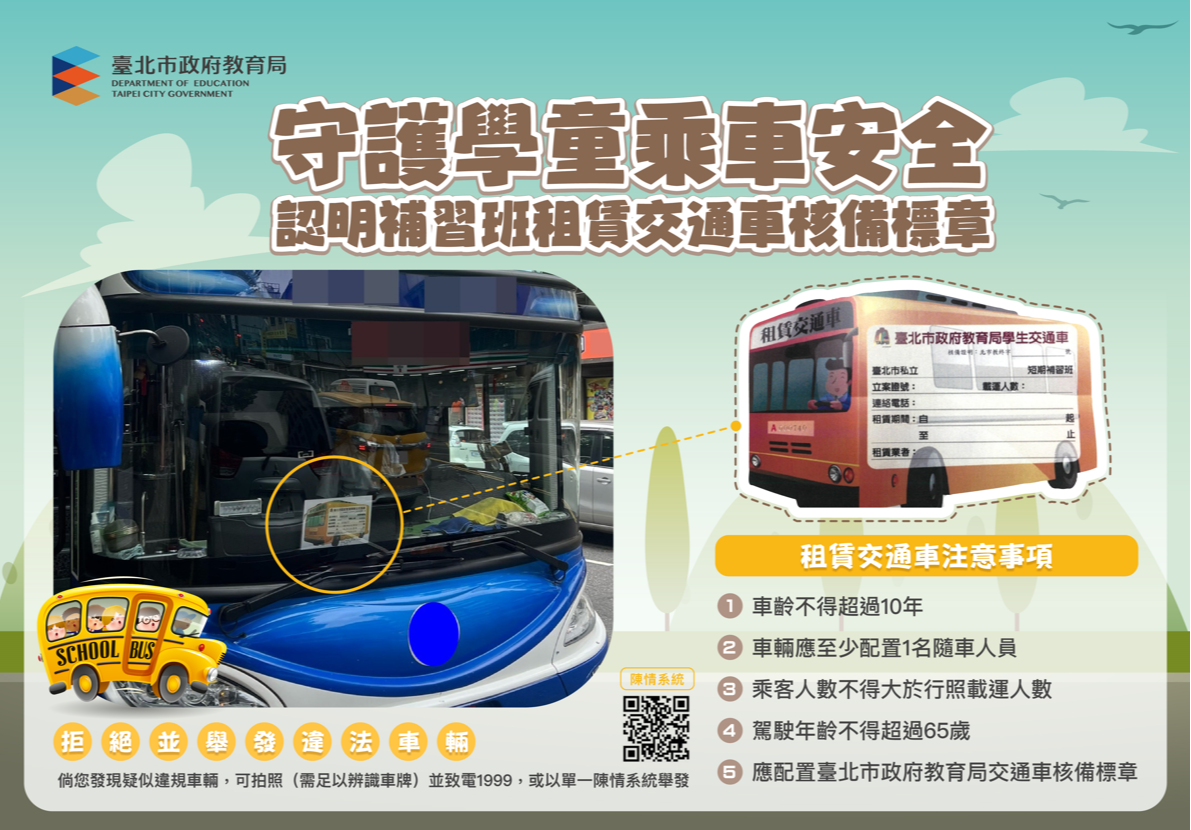 二、查學生交通車管理辦法第6條第2項規定:「租賃之學生交 通車,應於前後車窗及駕駛座左右外側標示清晰可識之學 生專車校(班)、中心名稱、電話、載運人數,短期補習 班及兒童課後照顧服務中心租賃者,並應加註立案字 號。」