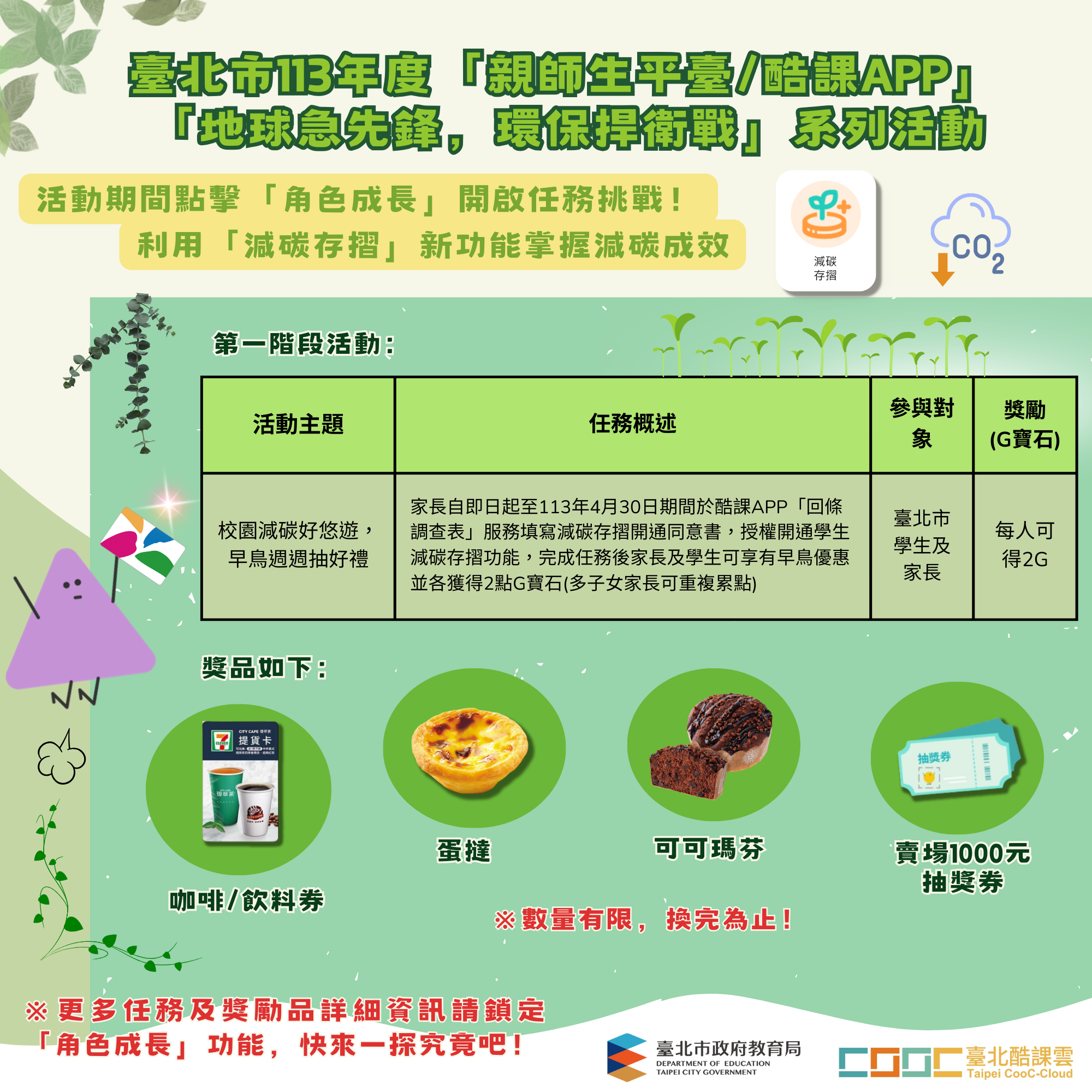 一、為響應2025淨零碳排目標,培養學生環境保育觀念,113年 4月於「親師生平臺/酷課APP」推出學生「減碳存摺」功 能,並結合酷課APP「角色成長」獎勵制度,推出「地球急 先鋒,環保捍衛戰」系列活動計畫(附件1)。