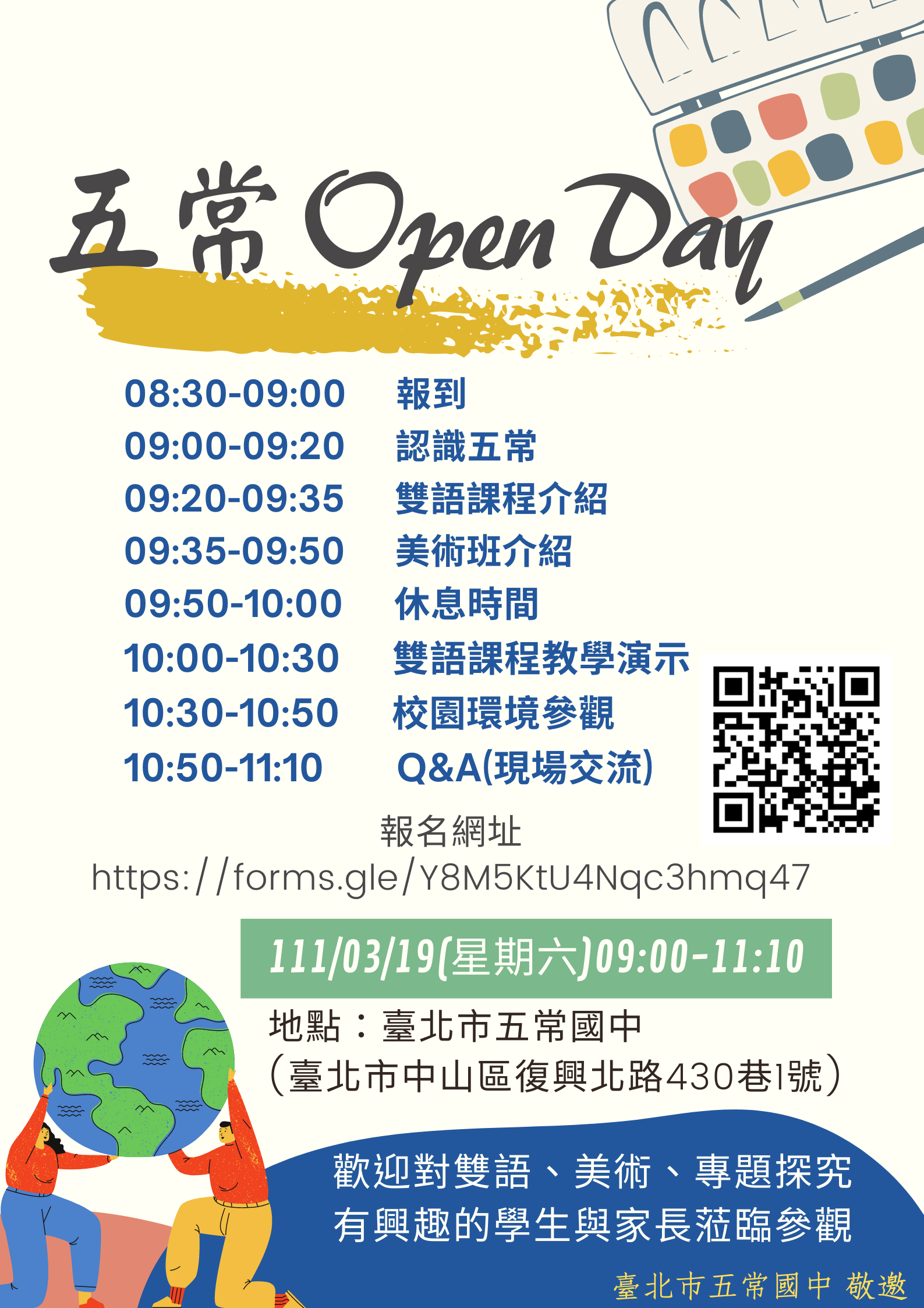 (五)活動地點:臺北市立五常國民中學(臺北市中山區復興北 路430巷1號)。