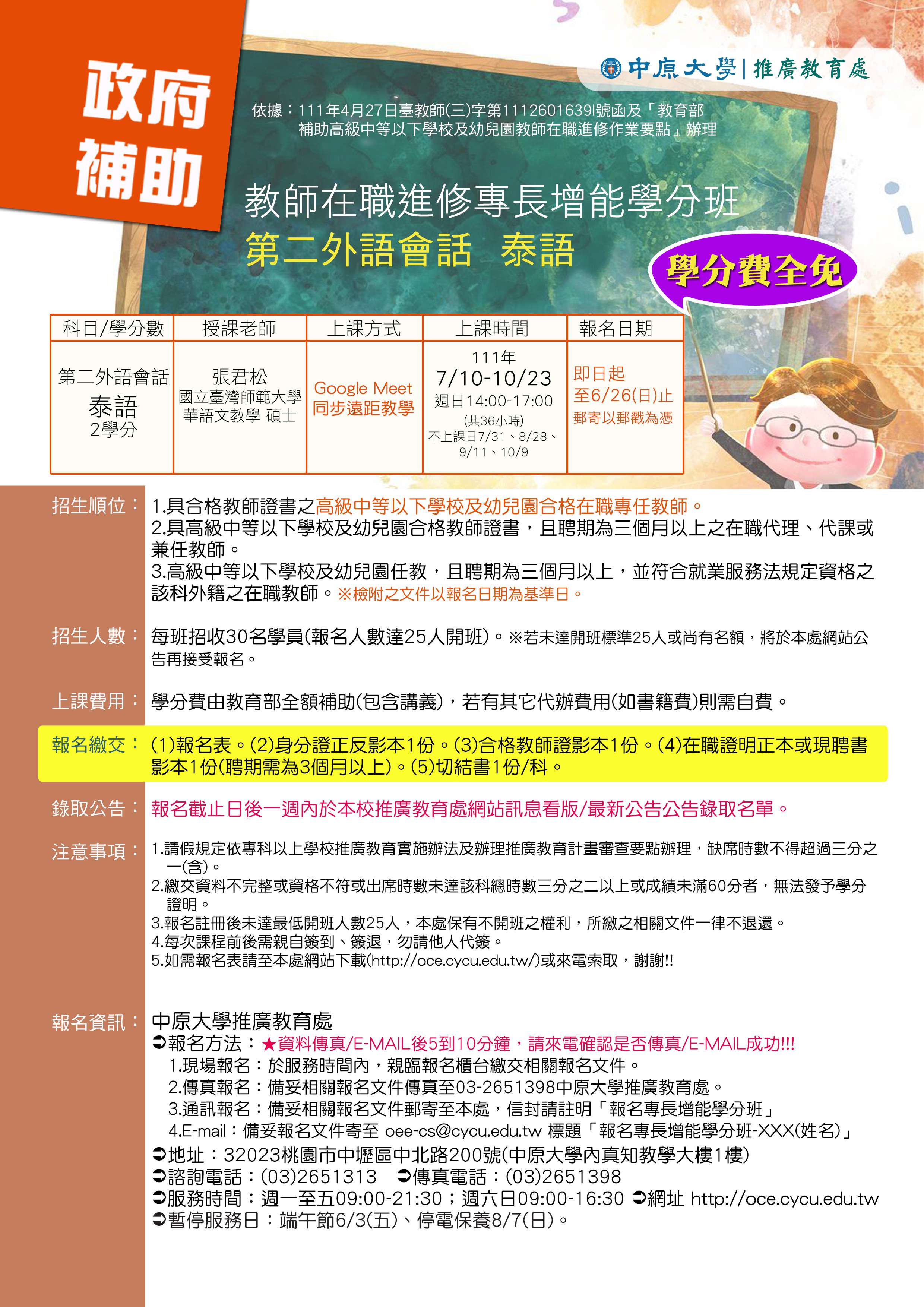 一、「第二外語會話(泰語)」課程之報名截止日為111年6月26日,限額30名。