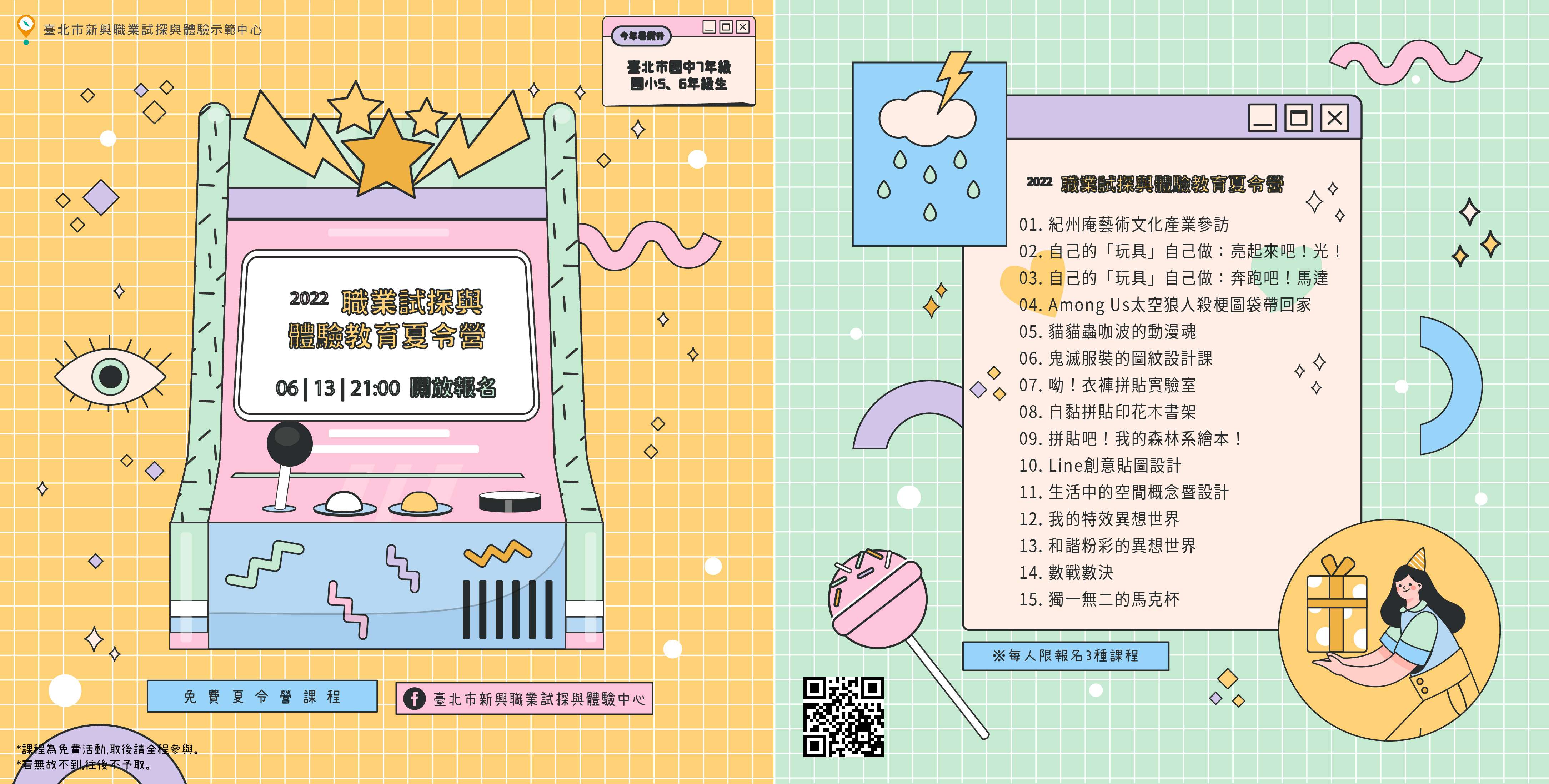 二、為增進本市學生對職業與工作世界之認識,提供學生職業 試探與興趣探索之機會,本市新興試探與體驗示範中心於 今年暑假規劃辦理職業試探與體驗教育夏令營。