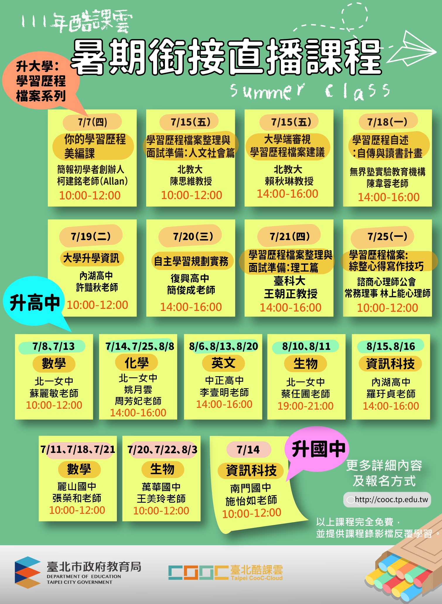 二、本課程實施時間自111年7月7(星期四)至8月20日(星期六) 止,詳細科目及直播時間請參閱計畫(如附件),或於臺北 酷課雲「酷課OnO線上教室」銜接課程專區(網址: https://ono.tp.edu.tw/)取得詳細資訊。