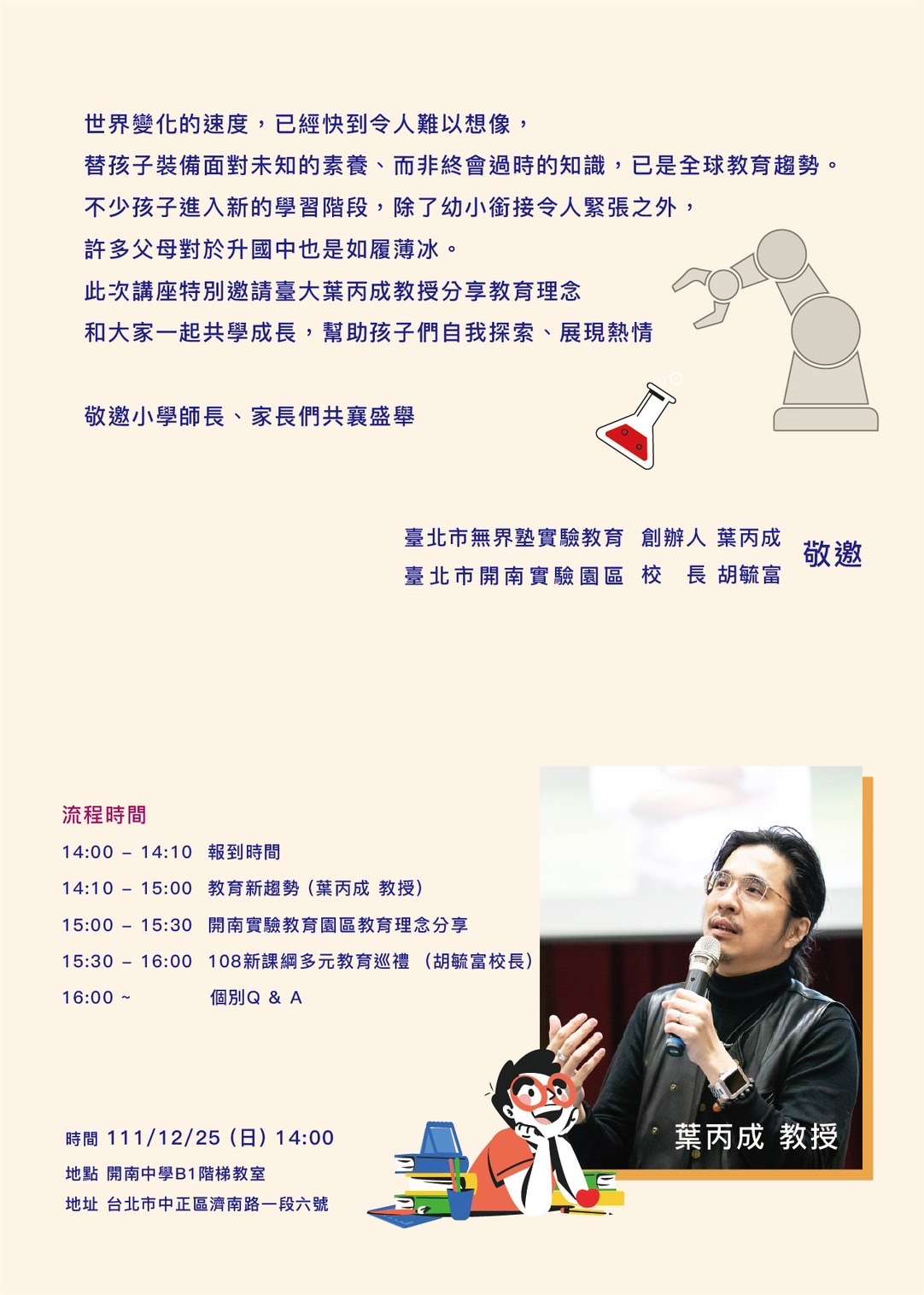 一、為使國小師生及家長更了解教育新方針,本校於111年12月25日(星期日)下午2:00~4:00辦理新時代新趨勢講座,隨函檢送「講座邀請函」,特邀貴校師長、即將升國中的學生與家長們蒞校參加。