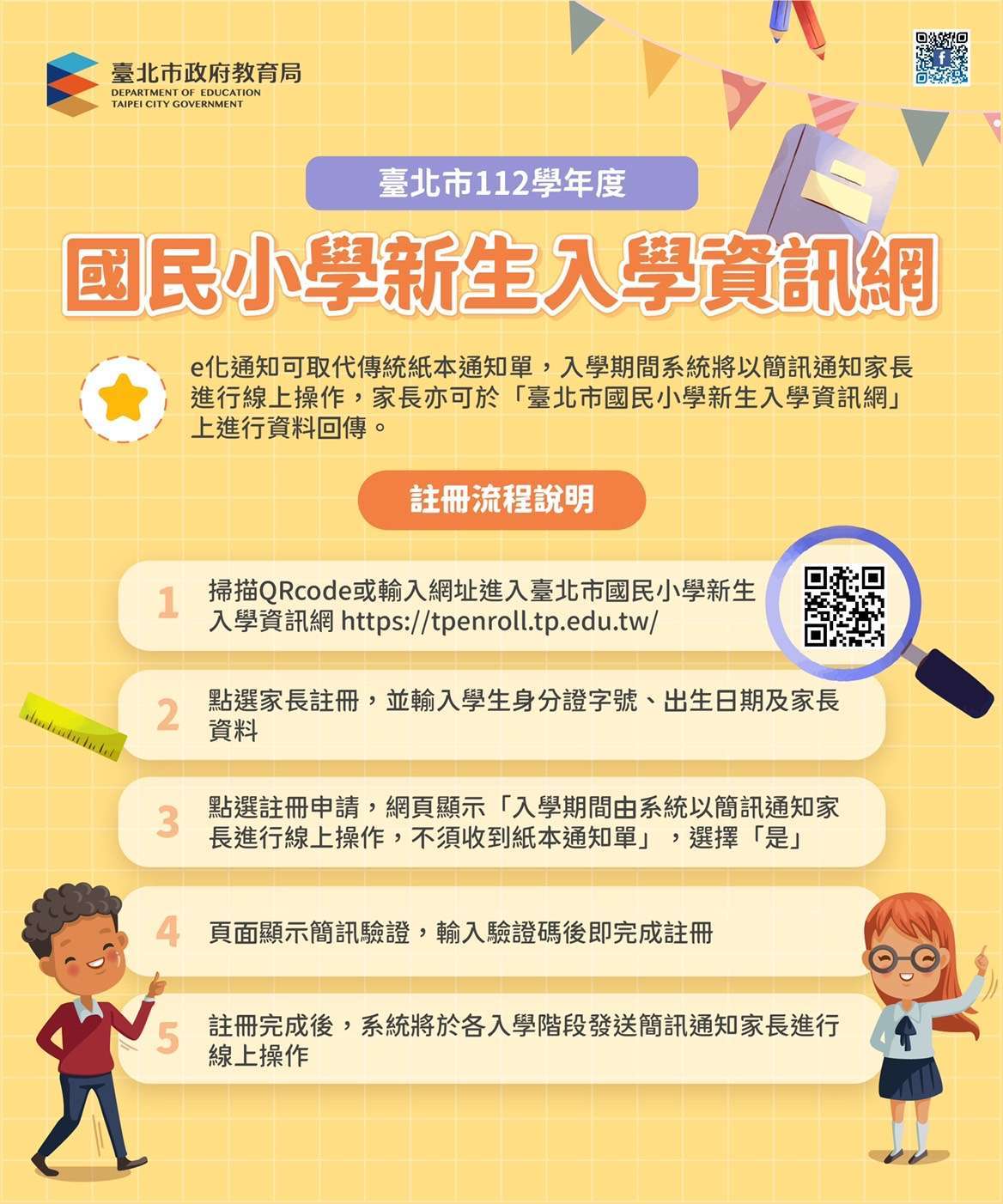 5/27(六)09:00~6/5(一)17:00 至臺北市國小新生報到入口網完成112學年度新生線上報到