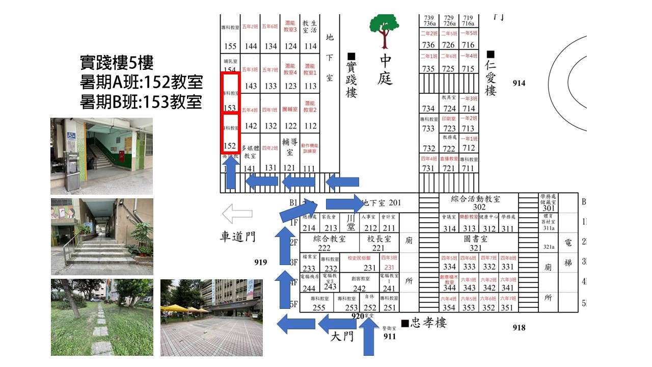本次暑期課後班因施工緣故,請學生依下圖路線上、下學。 教室位置位於實踐樓五樓: 暑期A班:152教室 暑期B班:153教室 暑期班級名單請見附件檔案。 如有相關疑問或請假事宜,請來電分機814 註冊組