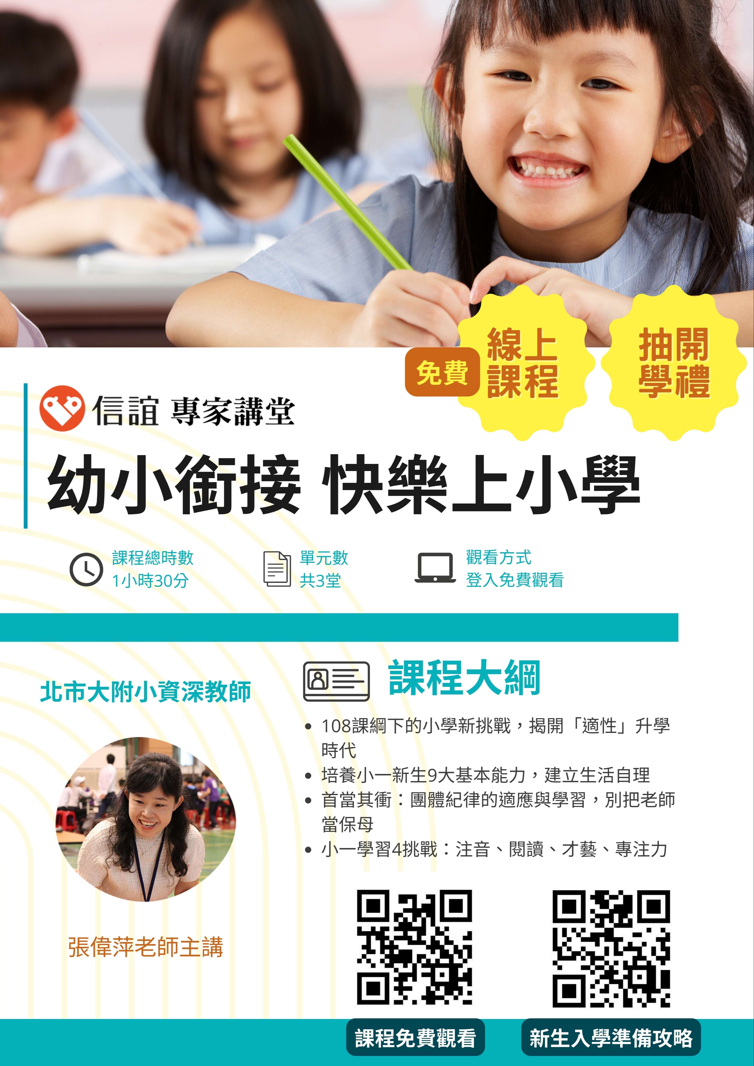 一、為幫助今年即將升小一的孩子順利銜接小學生活,信誼基金會提供線上課程「做好幼小銜接 快樂上小學」讓新生家長免費觀看,由北市大附小資深教師張偉萍主講,透過3堂課程帶爸媽認識小學世界,陪伴孩子上小學。三堂課主題 如下:
