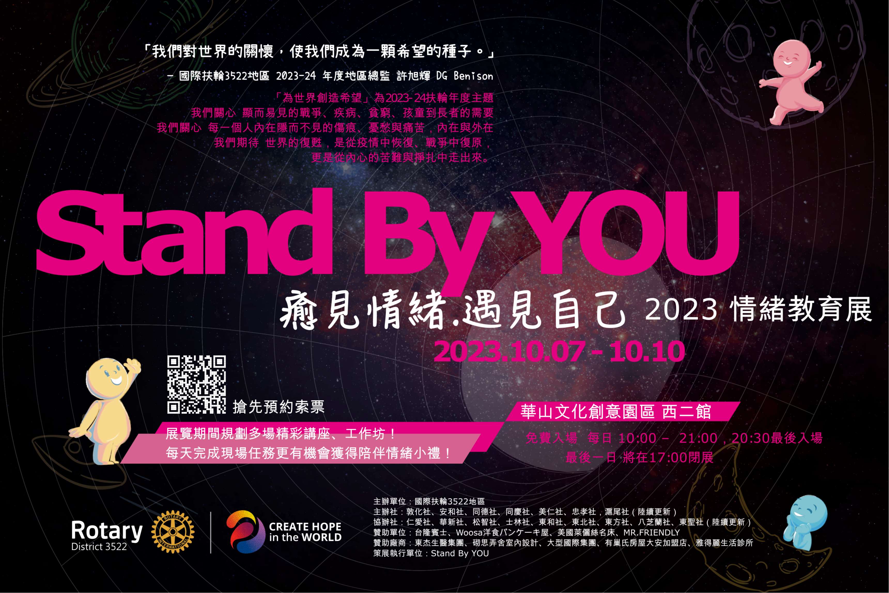 一、國際扶輪社為呼應2023年之年度主題「為世界創造希望」特聯合民間團體,規劃辦理「療見情緒,遇見自己—2023 Stand By You情緒教育展」系列活動,期以初級預防教育為目的,透過接納與包容,持續關注下一代內在需求議題。