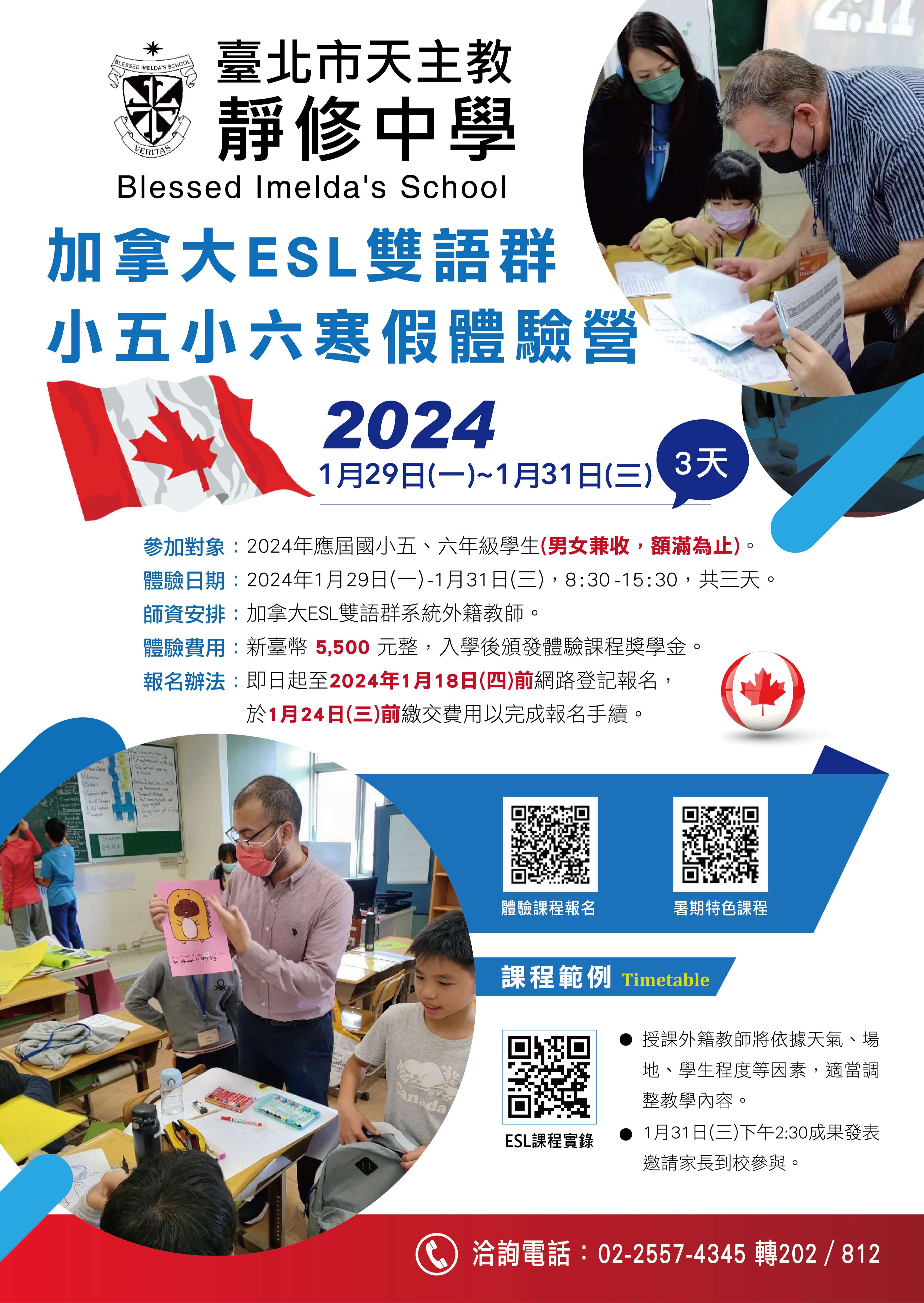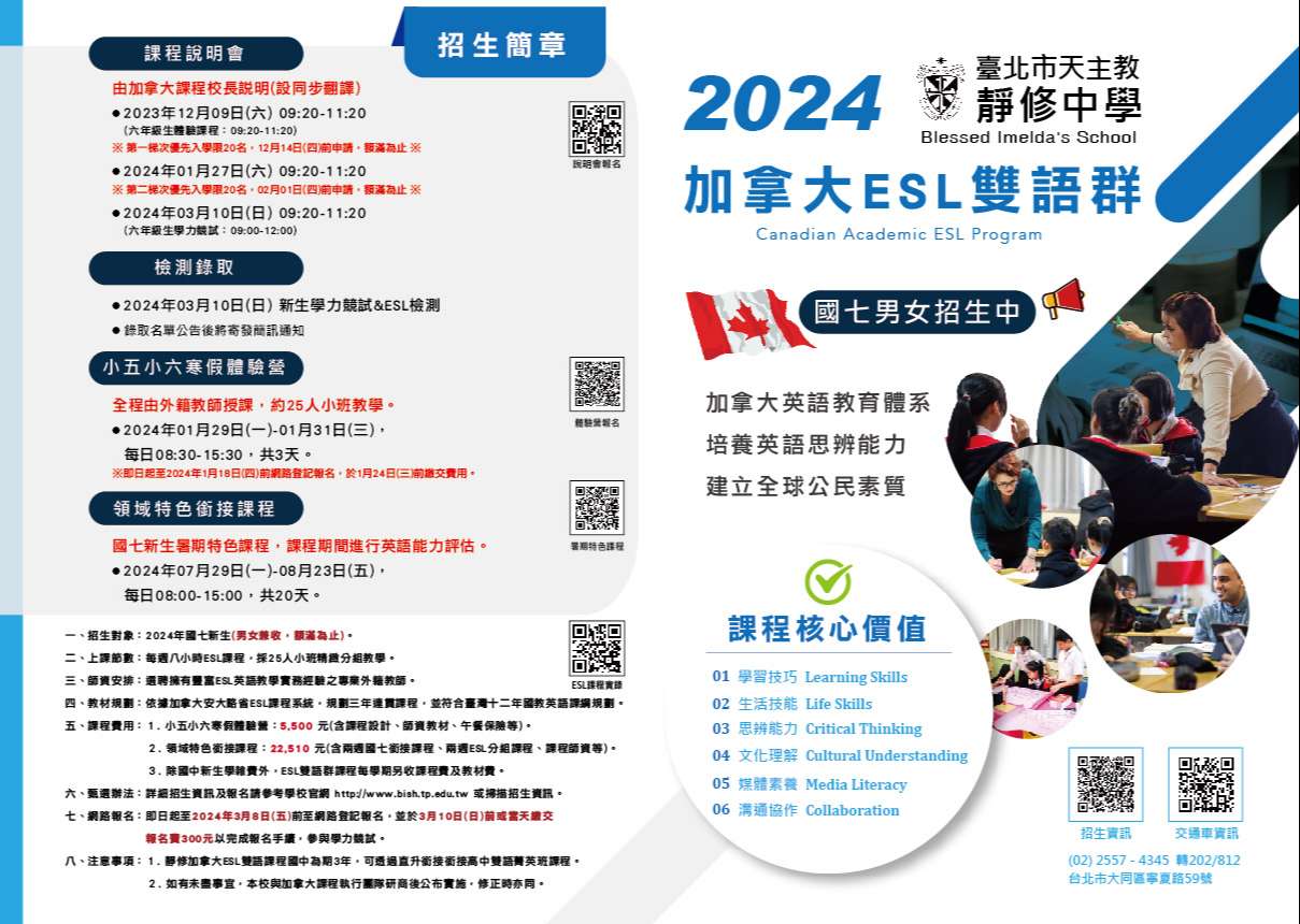 一、為使家長與學生充分了解本校國中部加拿大雙語課程、全人菁英課程之入學資訊,舉辦招生說明會,如下所示: