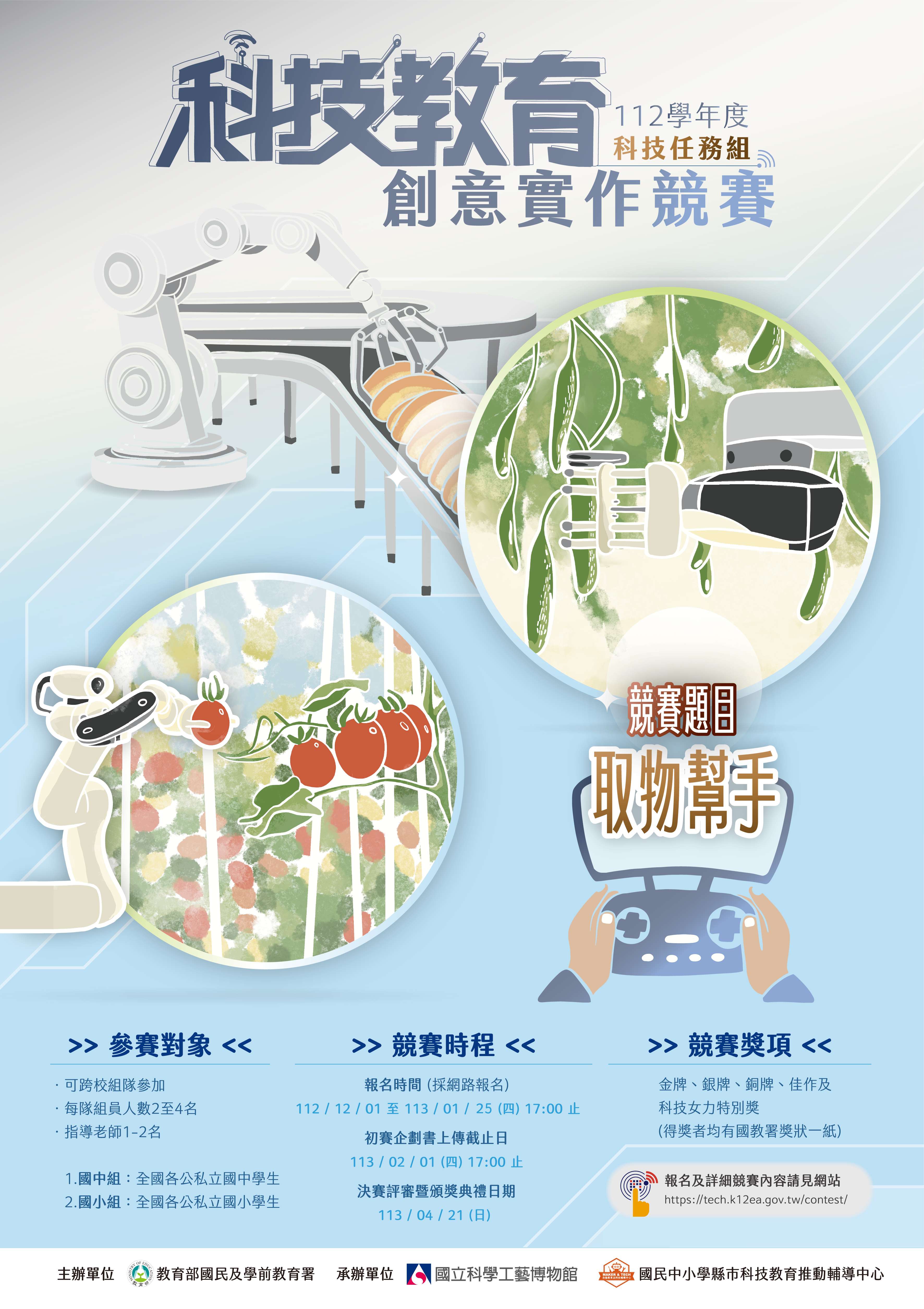 教育部國民及學前教育署辦理「112學年度科技教育創意實作競賽-科技任務組」報名時間延長至113年1月25日(星期四)