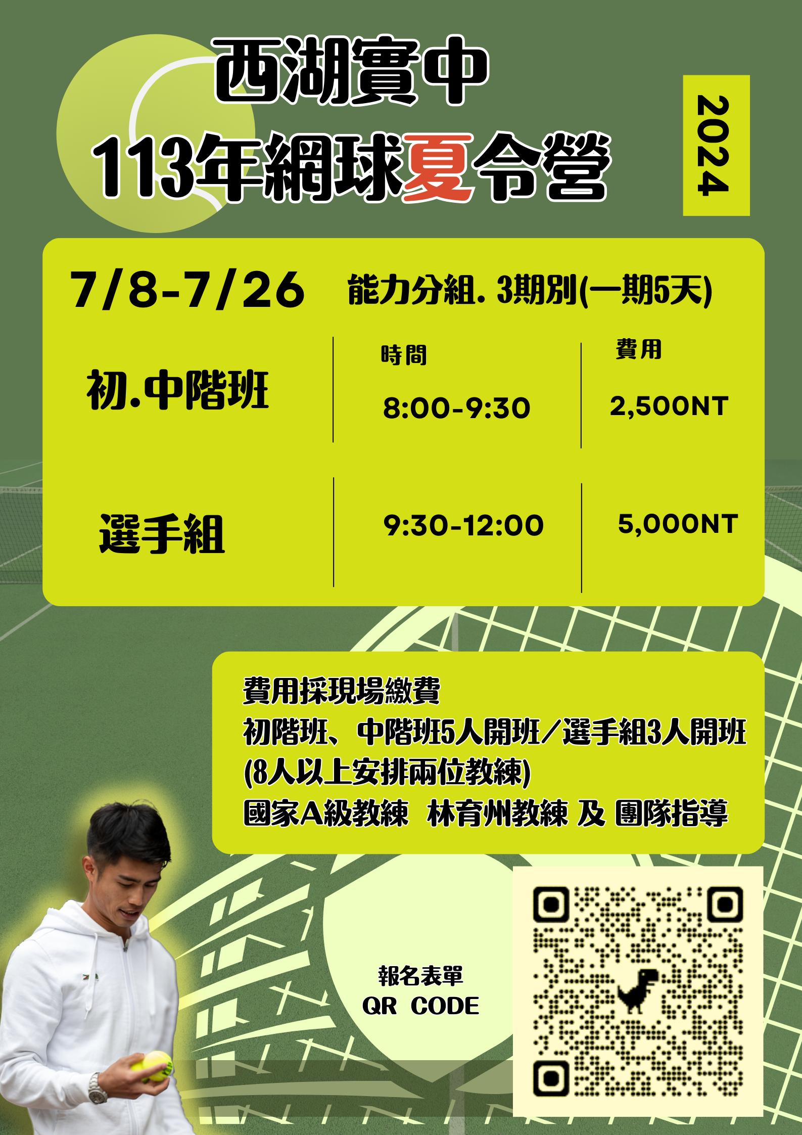 一、旨揭營隊摘要訊息如下: (一)營隊日期:113年7月8日至7月26日,計三週、每週2梯 次、每梯次5天,共計6梯次。 1、初、中階混和班(1): 113年7月8日至7月12日,每日 上午8:00-9:30,共計5天。 2、選手組(1):113年7月8日至7月12日,每日上午9:30- 12:00,共計5天 3、初、中階混和班(2):113年7月15日至7月19日,每日 上午8:00-9:30,共計5天。 4、選手組(2): 113年7月15日至7月19日,每日上午9: 30-12:00,共計5天。 5、初、中階混和班(3):113年7月22日至7月26日,每日上午8:00-9:30,共計5天。 6、選手組(3):113年7月22日至7月26日,每日上午9: 30-12:00,共計5天。 (二)費用:初、中階混合班2,500元;選手組5,000元。 (三)報名期間及方式:即日起至113年6月7日中午12時止,可 利用網路報名、紙本親自報名或傳真報名等方式。