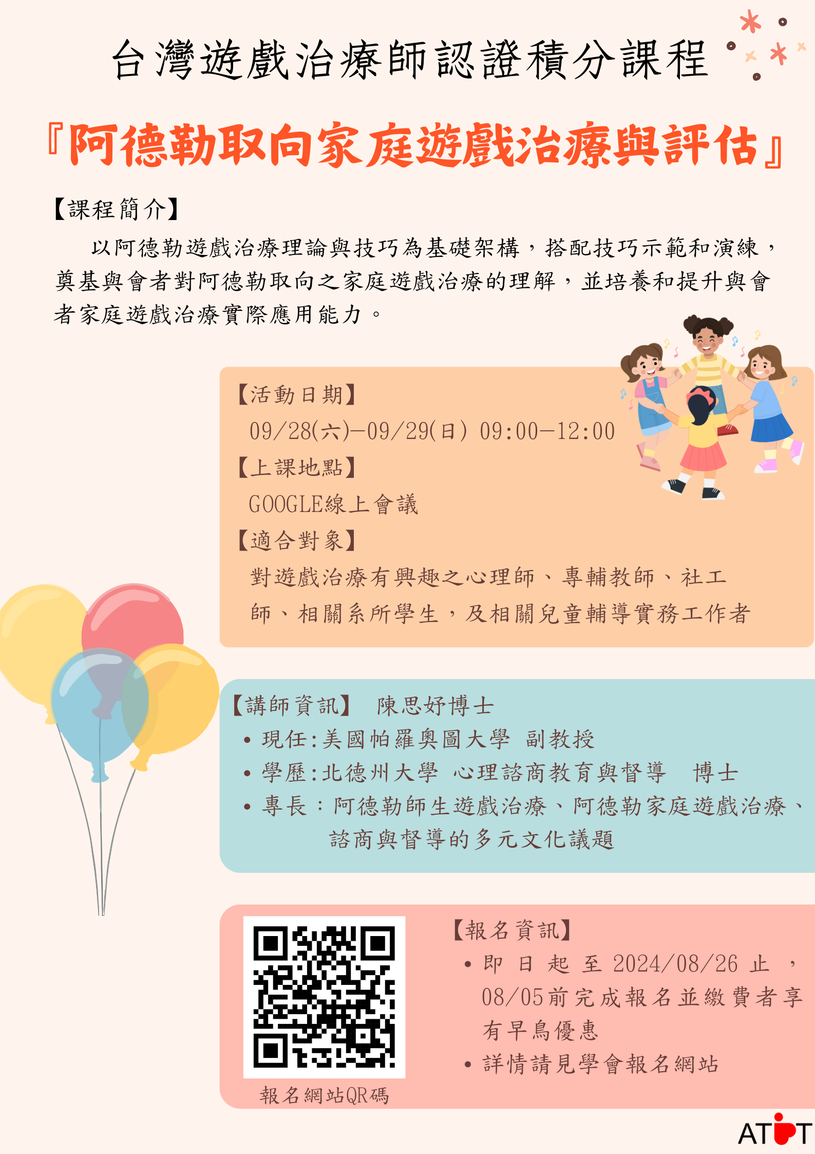 一、【2024台灣遊戲治療師認證積分課程】阿德勒取向家庭遊戲治療與評估,課程時間及講師資訊。