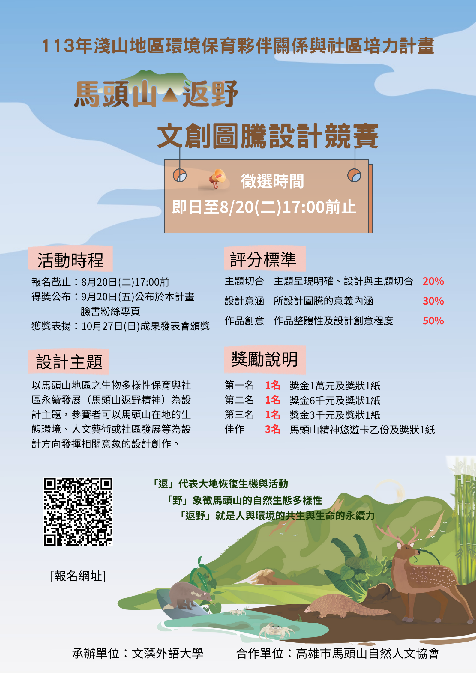 三、本計畫邀請全國各級學校的年輕學子和社區民眾參加,以 馬頭山地區之生物多樣性保育與社區永續發展(馬頭山返 野精神)為設計主題,創作結合文創品及圖騰的設計。