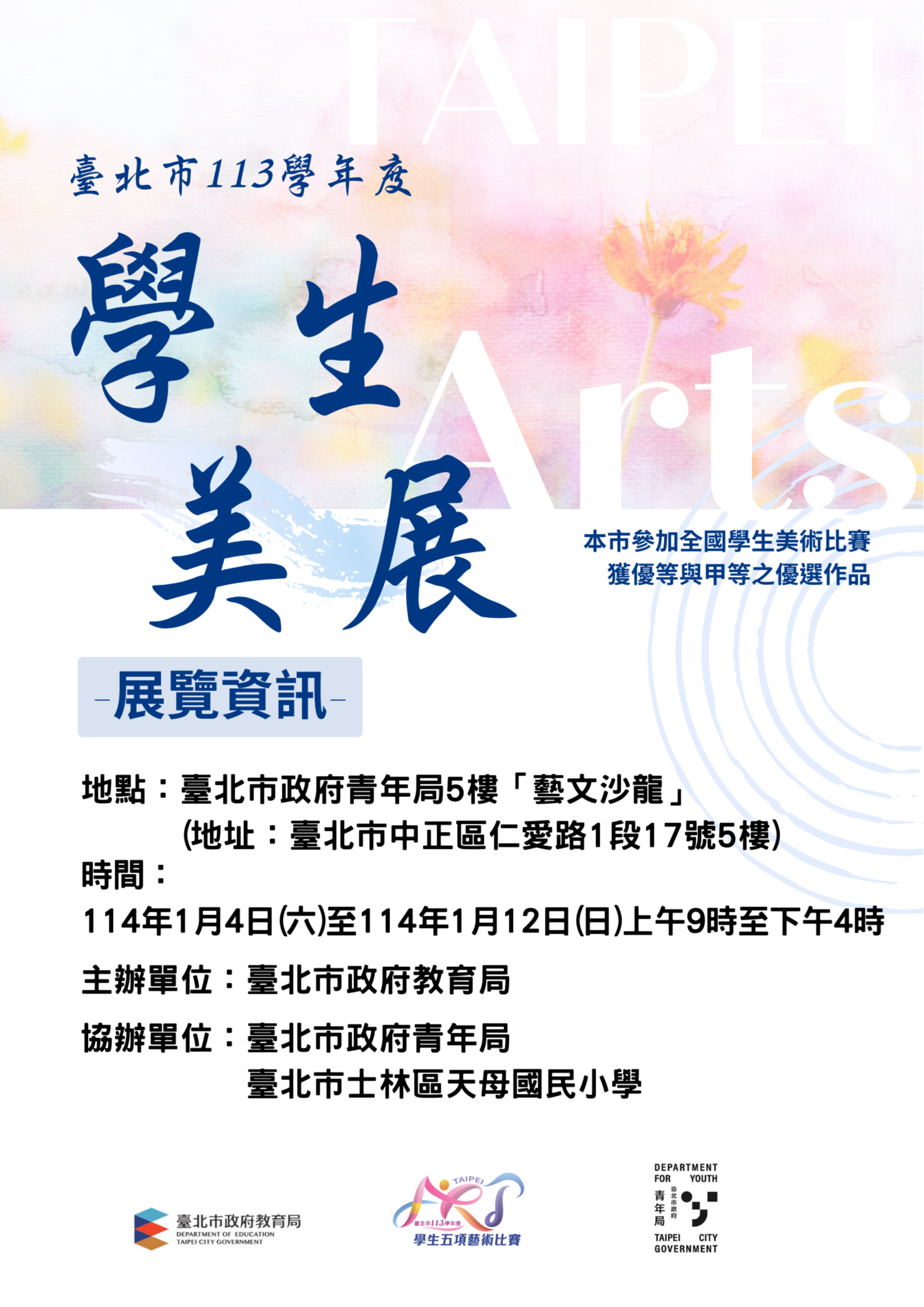 113學年度全國學生美術比賽」獲優等及甲等之作品展覽於臺北市政府青年局5樓「藝文沙龍」。