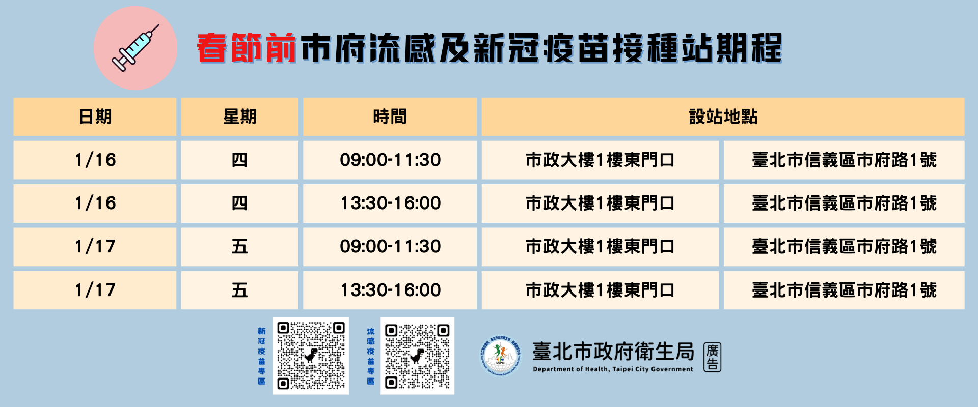 二、流感疫苗與新冠JN.1疫苗皆開放全民接種,為強化市府員 工及洽公民眾免疫力,降低流感與新冠肺炎傳染與群聚的 風險,本局於本府市政大樓設置免費疫苗接種站,提供接 種服務。