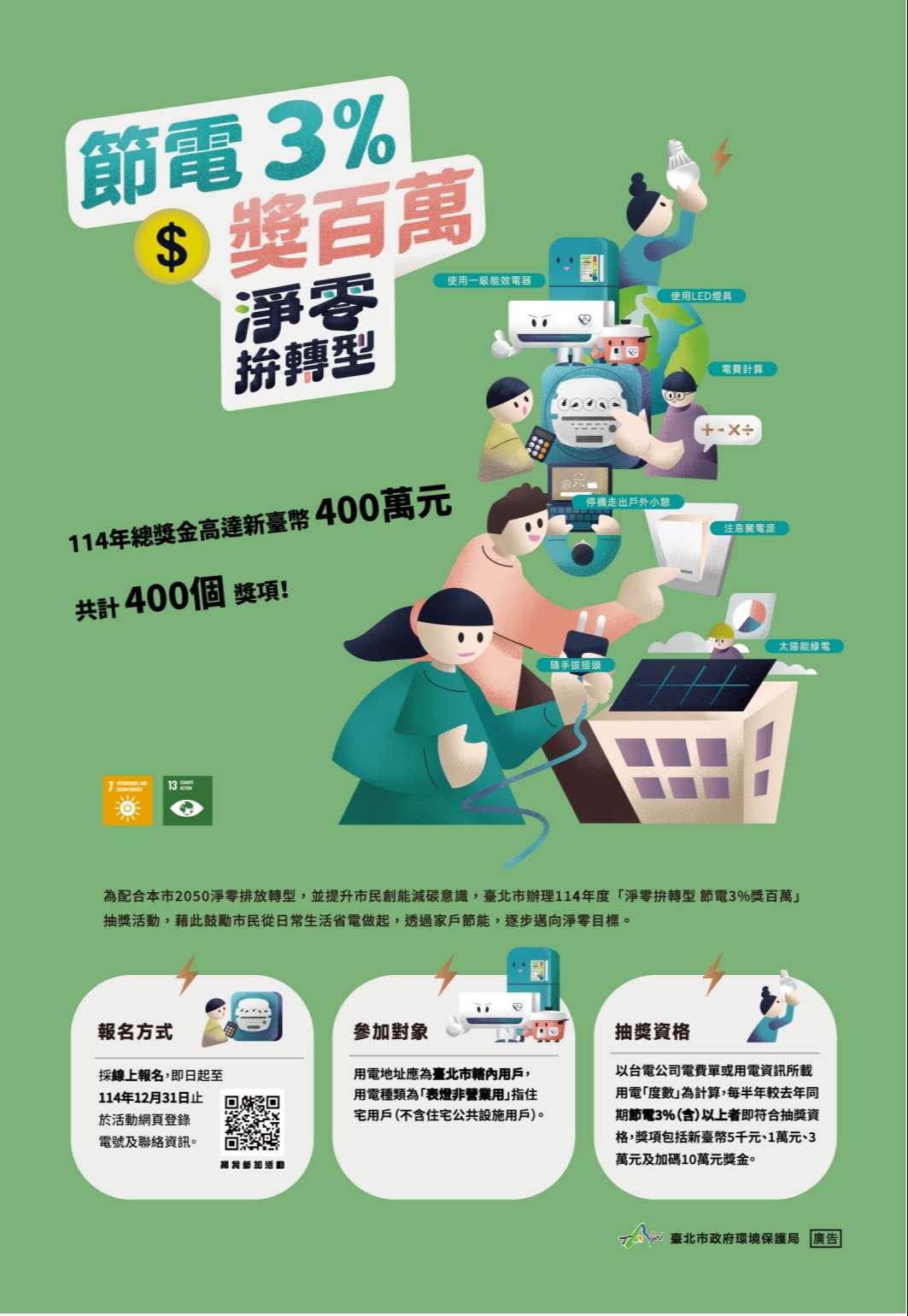 一、為鼓勵市民落實節能減碳行動,本局114年「淨零拚轉型節 電3%獎百萬」抽獎活動,即日起至114年12月31日辦理