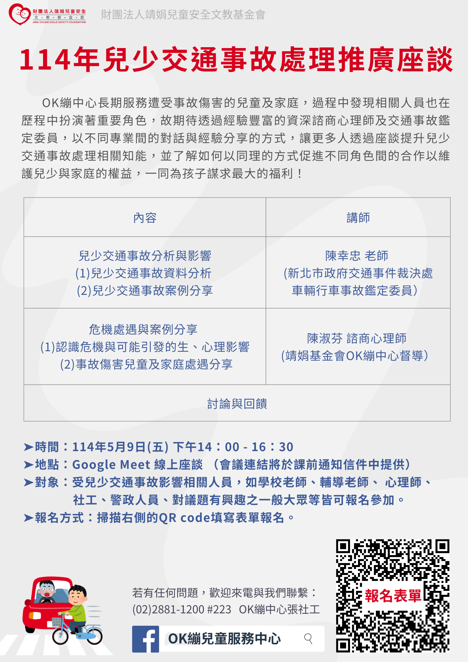 三、活動報名及相關資訊,請洽詢靖娟基金會OK繃兒童服務中 心。 四、檢附「114年兒少交通事故處理座談」宣傳單張1份。