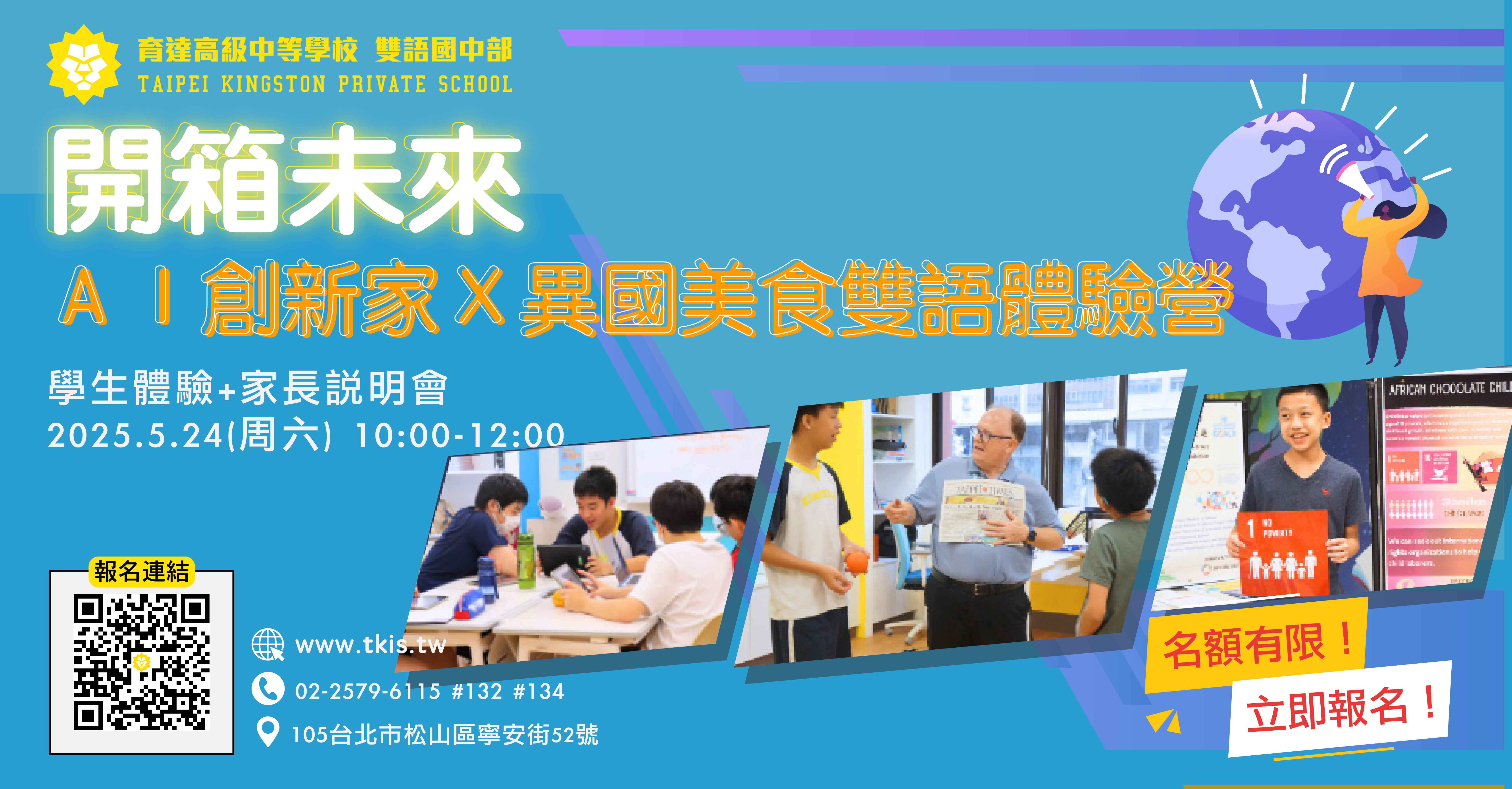 一、課程介紹:在全球化的時代,雙語能力是孩子未來發展的重 要資產,本次Kingston雙語體驗營集結本校外師與中師, 設計一系列豐富有趣的體驗課程,讓學生能在半日的課程中學習如何以地球永續的概念,結合AI科技趨勢,設計未來產品,外師分享異國美食文化,打開國際觀!我們也在 同一時間安排入學說明會,深入介紹我們的課程規劃與環境導覽,歡迎爸爸媽媽帶著您的孩子一同報名參加!