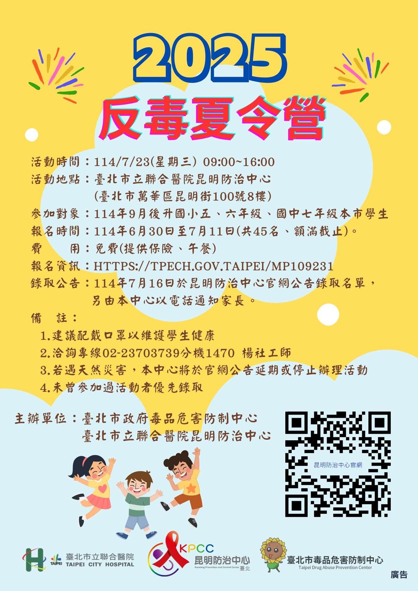 八、檢附營隊宣傳海報1份,請協助公告宣傳,相關報名資訊可至昆明防治中心官網查詢(https://tpech.gov.taipei