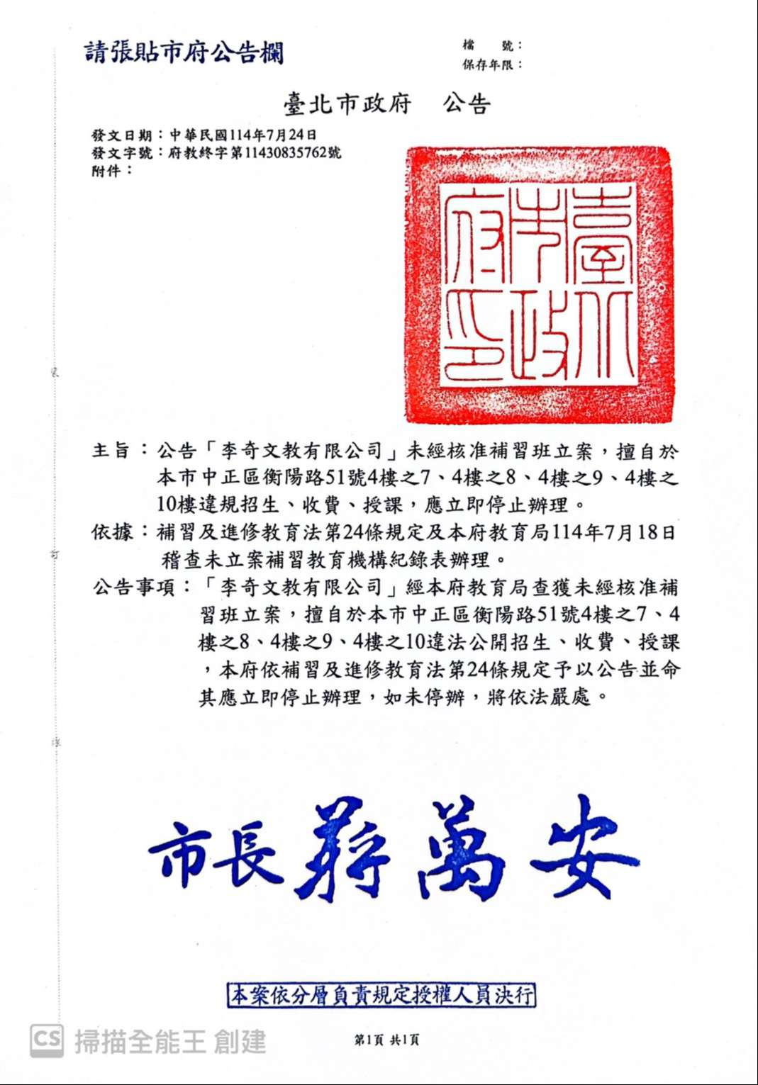 二、「李奇英文」(李奇文教有限公司)經本局查獲未經核准 補習班立案,擅自於本市中正區衡陽路51號4樓之7、4樓之 8、4樓之9、4樓之10樓違法招生、收費、授課,經市府依 補習及進修教育法第24條規定裁處及公告,並命其立即停 止辦理。
