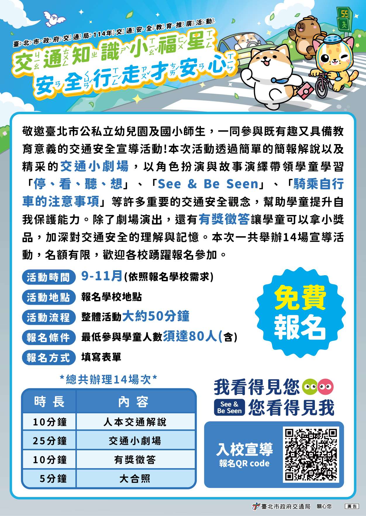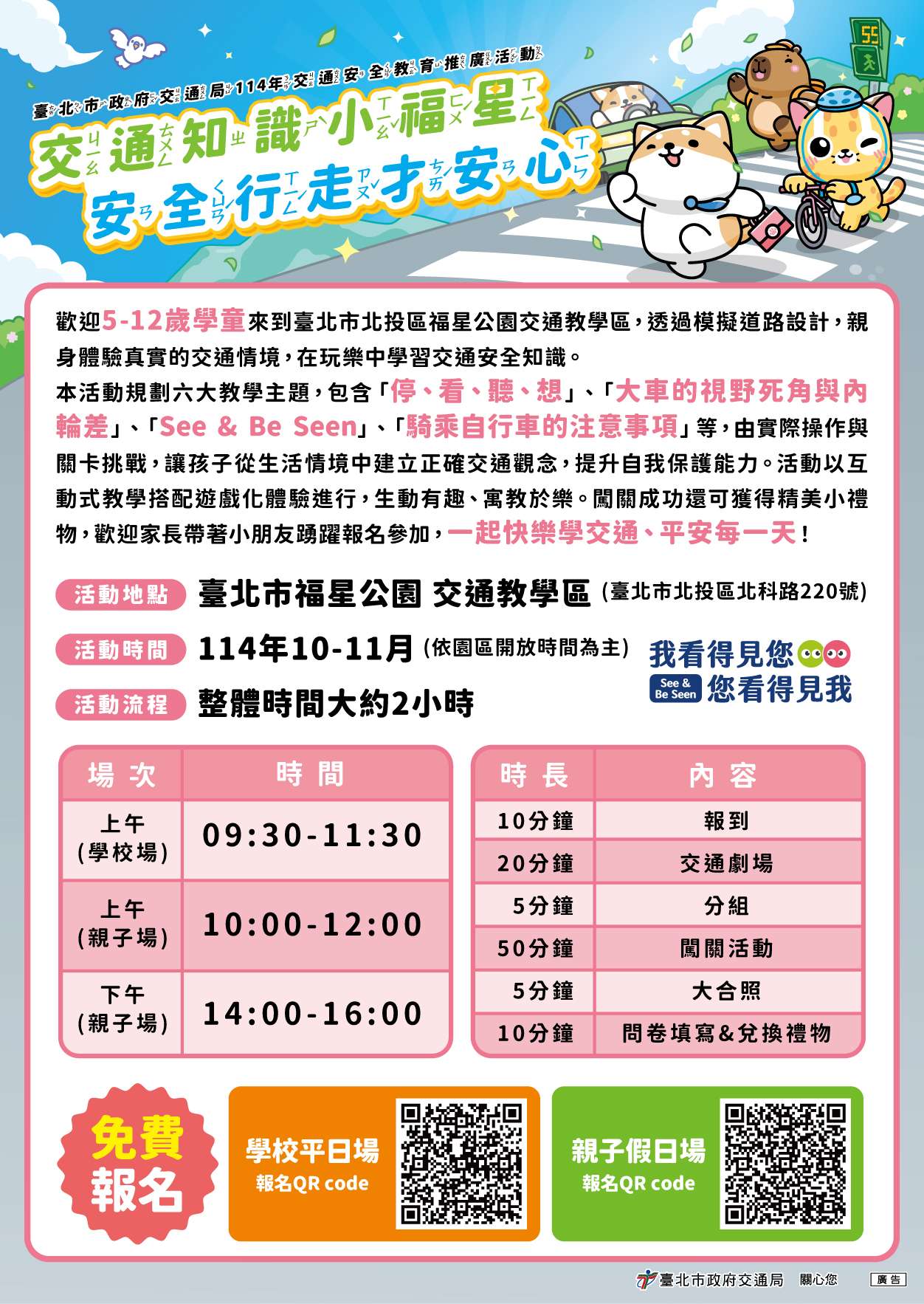 為增進兒童交通安全知能,透過辦理交通公園推廣活動, 引導兒童正確學習穿越路口及避開視野死角等技巧,以提 升自我保護能力,降低交通事故發生風險,本府交通局於 今(114)年10月將新增啟用第二座交通公園交通教學區 (實際啟用日期依交通局通知為主),位置於臺北市福星 公園(臺北市北投區北科路220號)。該局委託雷科斯國際 有限公司於該教學區辦理「114年交通安全教育推廣活 動」,訂於114年9月至11月間舉行,內容如下: