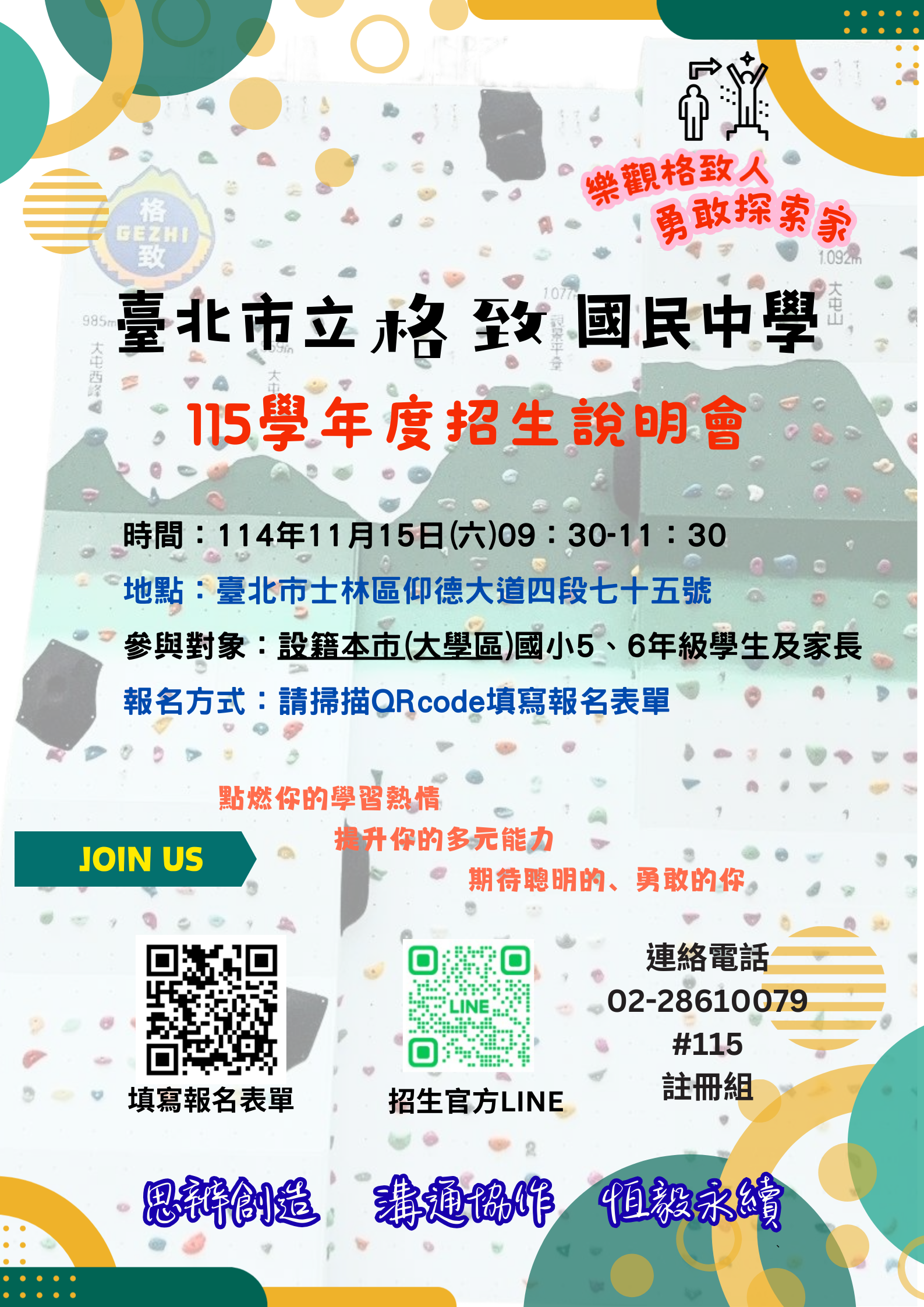 二、本校為大學區學校,凡設籍臺北市之新生皆可就讀。為使 更多學生及家長了解本校辦學資訊,特辦理旨揭說明會, 敬請協助公告說明會訊 息。
