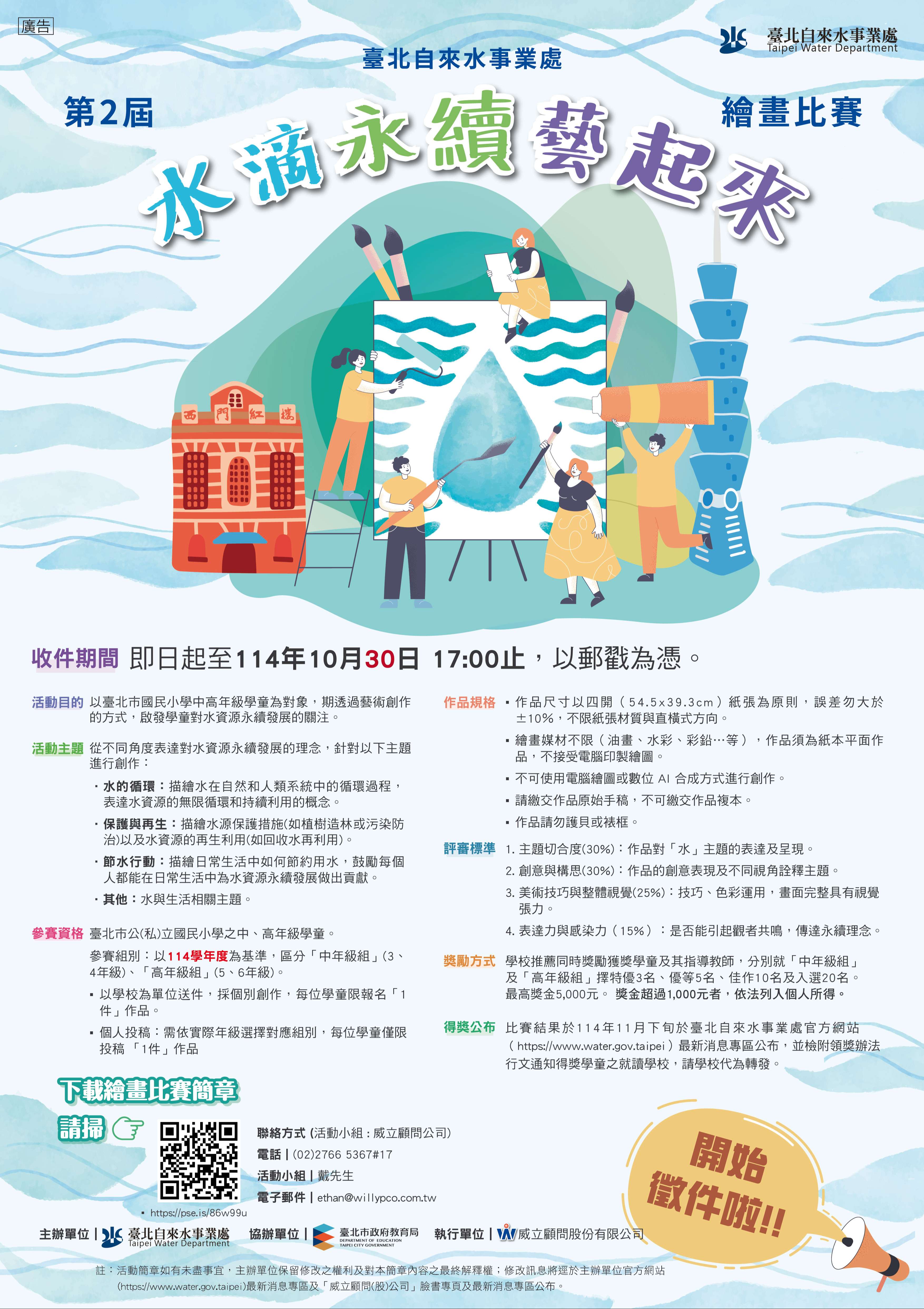 三、檢送114年第2屆「水滴永續藝起來」繪畫比賽簡章(修正 版)及海報各1份(如附件)。
