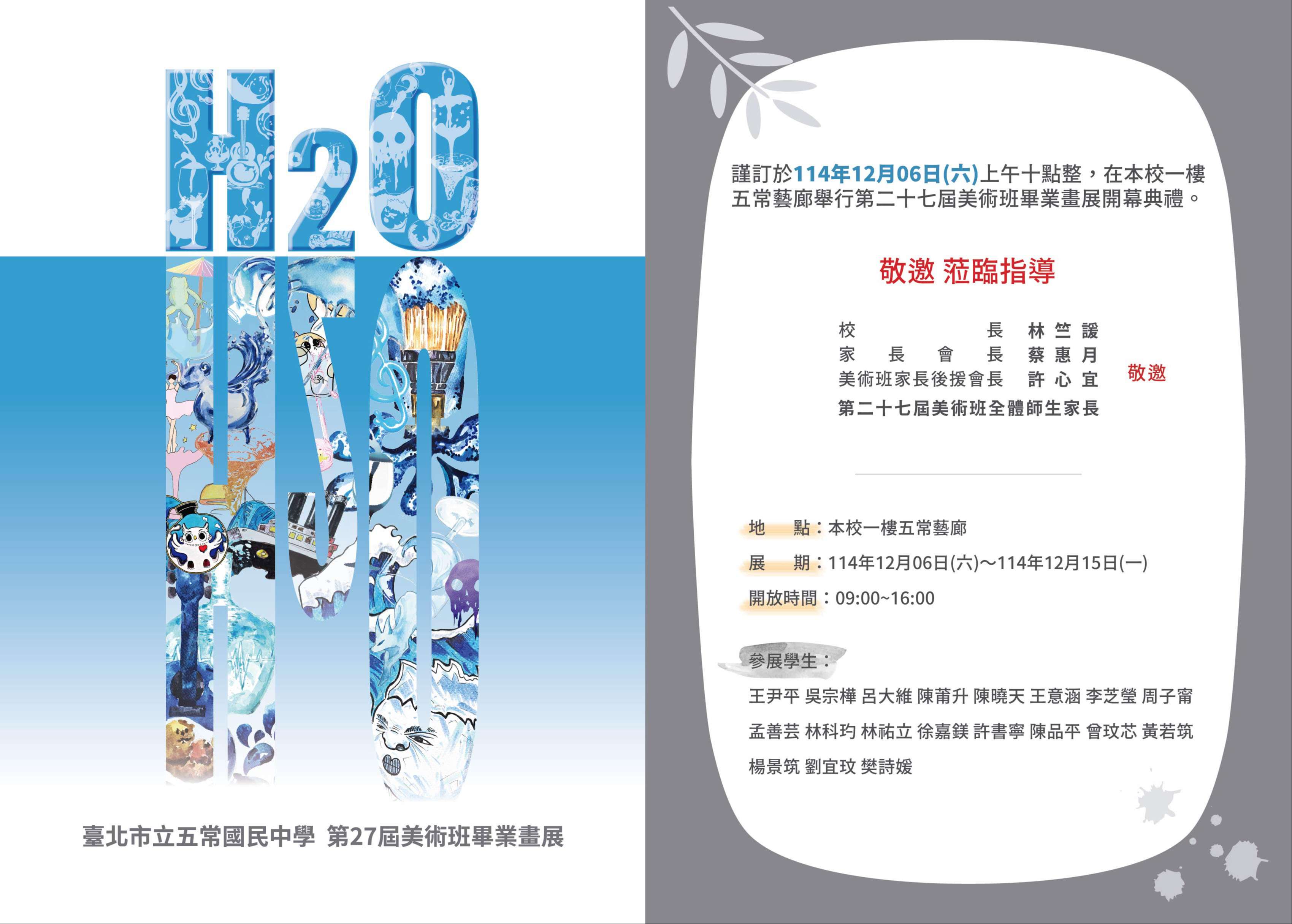 一、本校謹訂於114年12月6日(星期六)舉行本校第27屆美術班 「H2O」畢業畫展活動,開幕典禮為上午10時舉行,歡迎各界貴賓共襄盛舉。