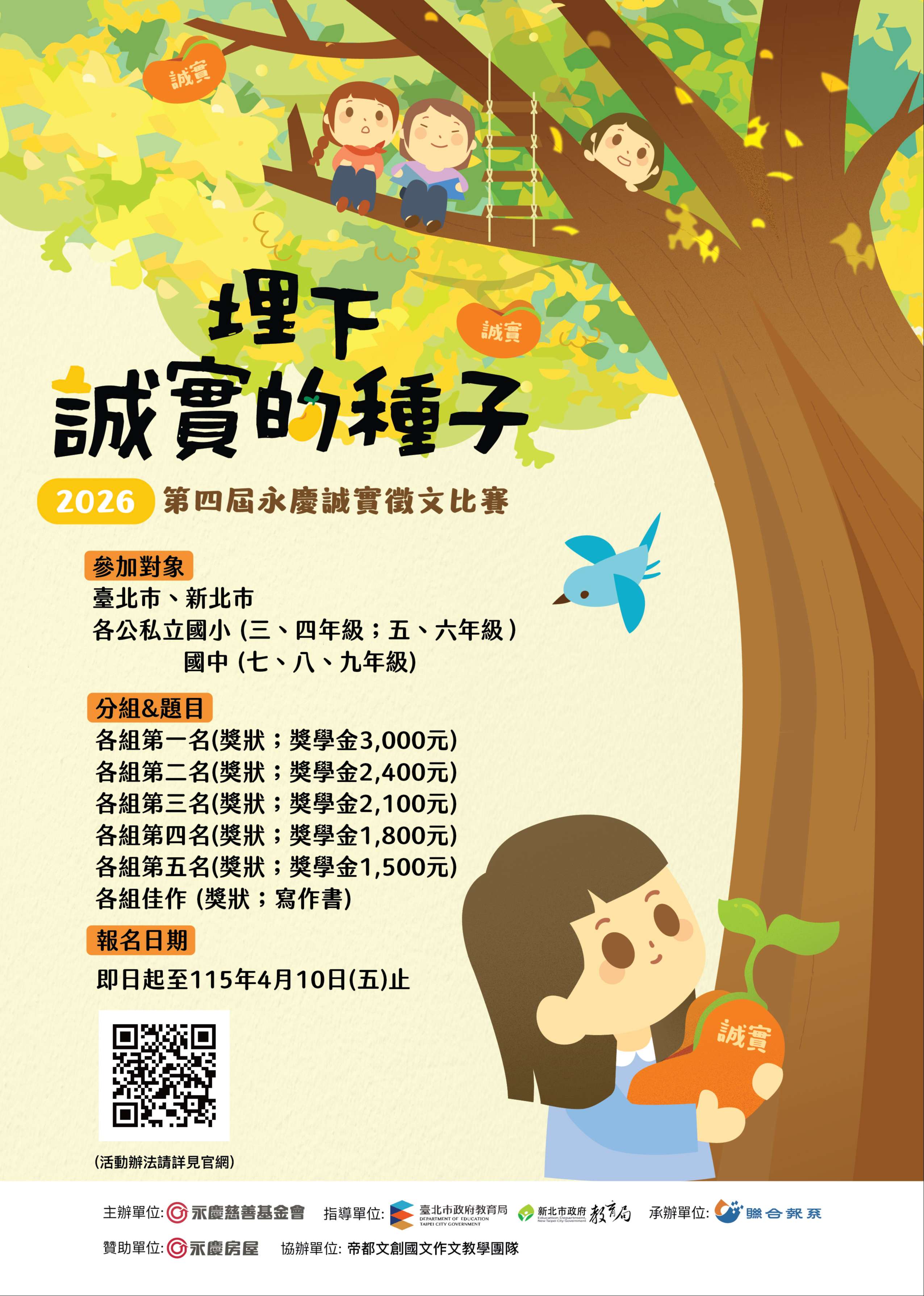 二、旨案乃為透過徵文活動,培養學生對於生活的觀察力,並 從寫作中探索自我價值與思潮,讓品格教育的觀念向下扎根,以「埋下誠實的種子」為主題,希望學生從將品格素 養融入文字的過程中,亦將優良德行落實於日常生活、徵 文活動內容摘要如下: