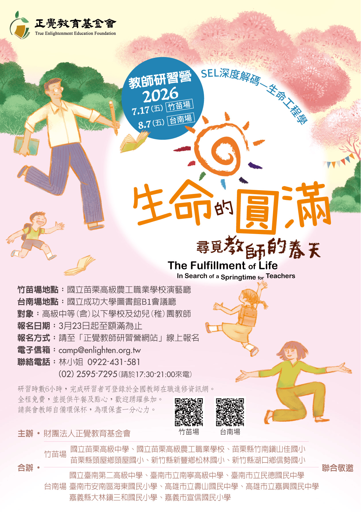 二、本基金會於2026年暑假期間舉辦竹苗、臺南兩場教師研習 活動「生命的圓滿──尋覓教師的春天」如下: