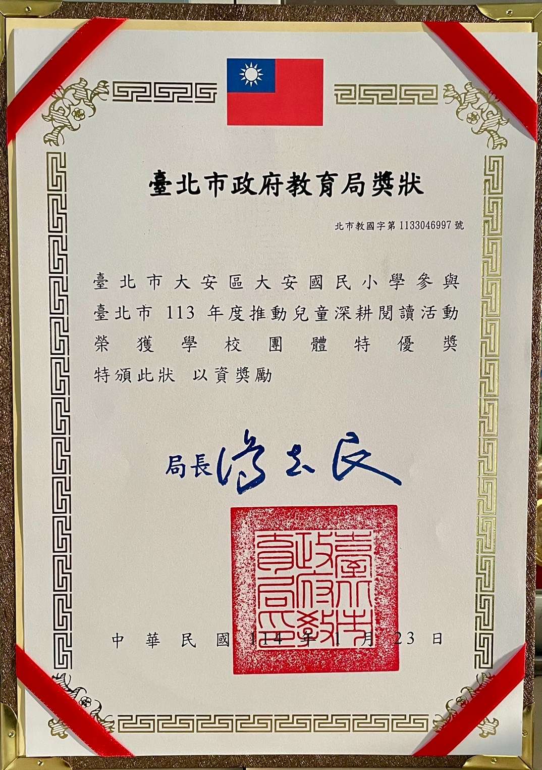 本校參加臺北市113年度推動兒童深耕閱讀活動,榮獲學校團體特優獎,自111年起,連續三年獲此殊榮,感謝所有參與本校推動閱讀的師長及志工,用心耕耘、推廣閱讀活動。